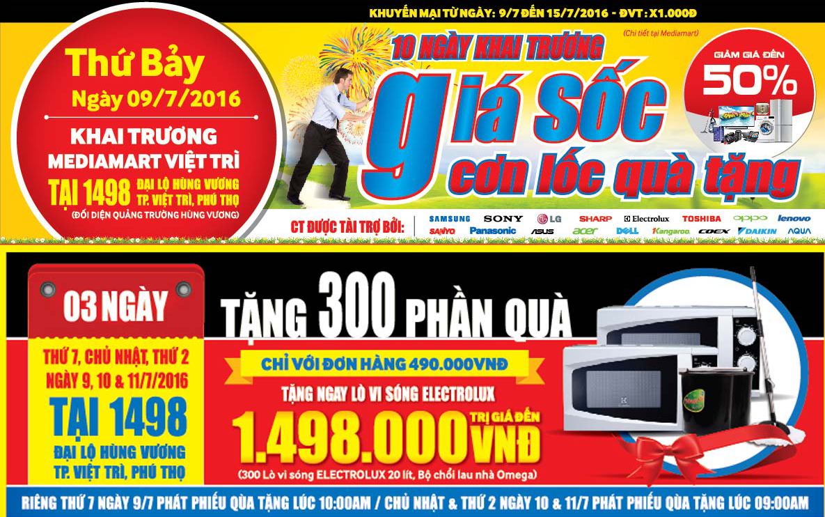 Nhân dịp này, MediaMart mang đến chuỗi chương trình "Giá sốc cơn lốc quà tặng". Theo đó trong 3 ngày vàng từ 9/7-11/7, chỉ với đơn hàng 490.000VNĐ, 300 khách hàng đầu tiên của MediaMart Việt Trì sẽ được nhận ngay các phần quà tặng cao cấp trị giá đến 1.498.000 đồng như Lò vi sóng Electrolux 20 lít hay Bộ chổi lau nhà đa năng Omega.