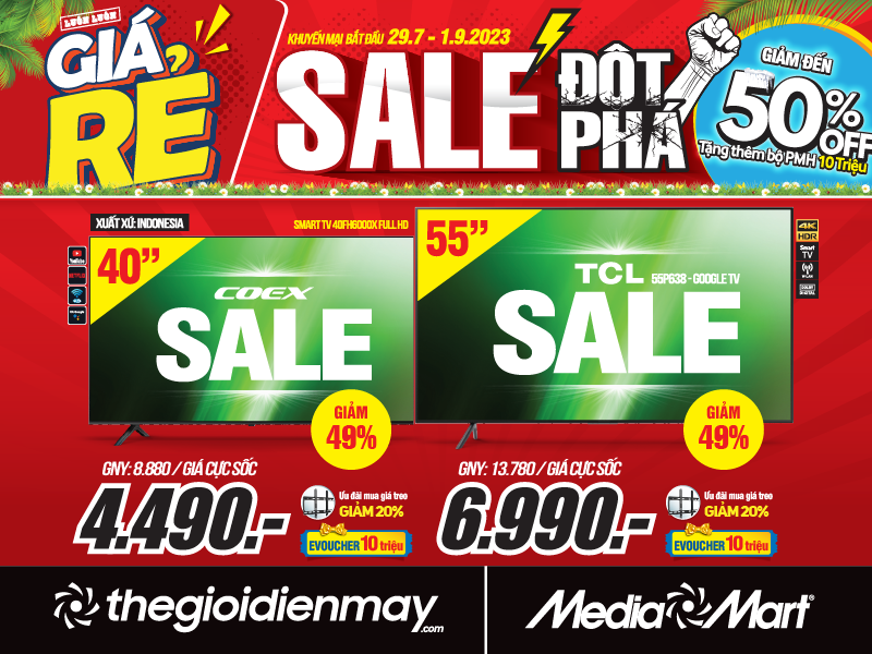 Cụ thể, Smart Tivi Coex 40 inch 40FH 6000X FHD và Smart Tivi TCL 4K 55P638 55 inch Google TV đều có mức giảm mạnh 49% lần lượt có giá là 4,49 triệu đồng và 6,99 triệu đồng. Đây đều là những mẫu tivi có kịch thước khá phù hợp với những căn phòng có diện tích nhỏ và vừa như phòng ngủ, phòng làm việc…