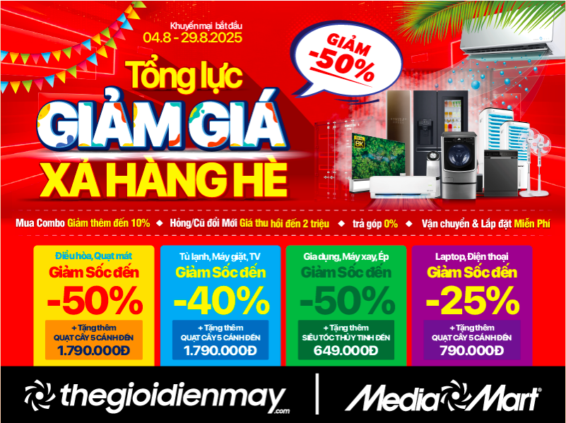 Tháng 8, khi mùa nóng đang dần khép lại, MediaMart tập trung mạnh mẽ vào chiến dịch “TỔNG LỰC GIẢM GIÁ – XẢ HÀNG HÈ -50%”, mang đến cơ hội mua sắm hiếm có cho khách hàng. Không chỉ dừng lại ở ưu đãi giá sốc, chương trình còn quy tụ hàng ngàn sản phẩm gia dụng, điện tử, làm mát và thiết bị nhà bếp với mức giảm sâu chưa từng có: