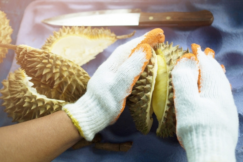 - Dùng găng tay bảo hộ: Đây là một điều rất cần thiết để tránh bị gai đâm vào tay. Chọn loại găng tay dày, có độ bám tốt để cầm chắc trái sầu riêng mà không bị trượt.