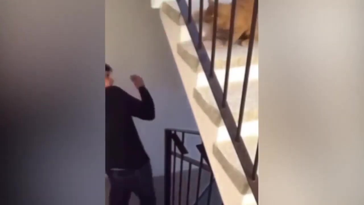 Mèo cà khịa chủ khi lên xuống cầu thang