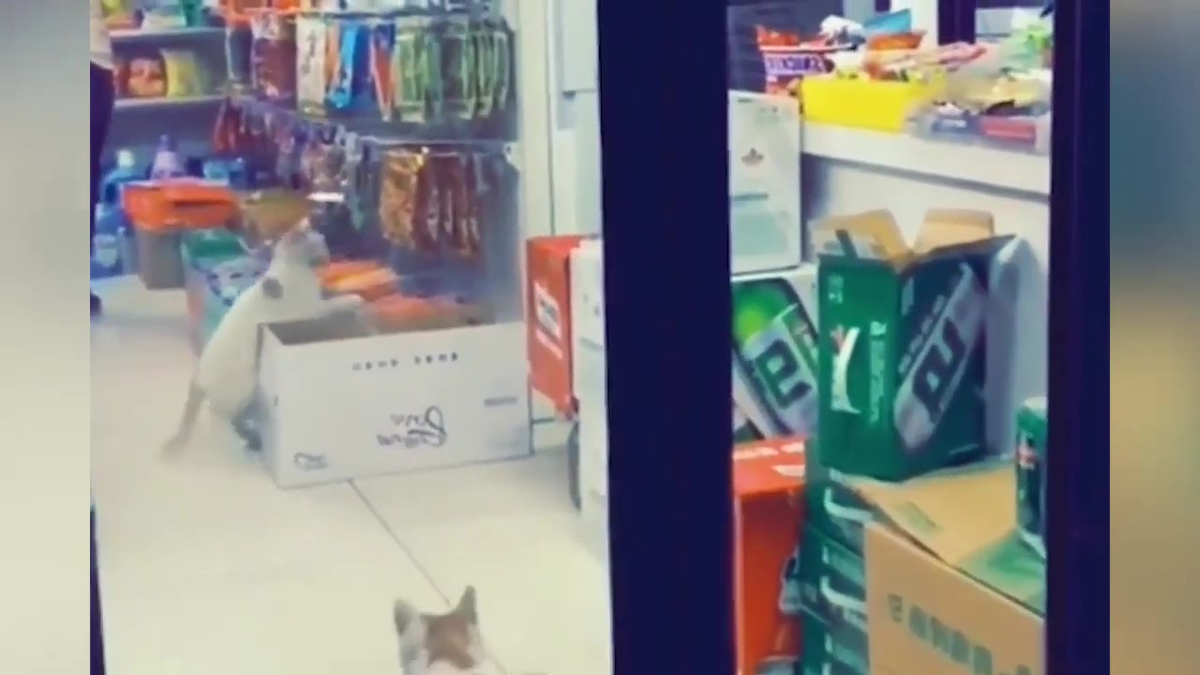 Hai con mèo lén lút, thông đồng với nhau vào cửa hàng trộm đồ rồi vụt chạy ngay khi xong việc.