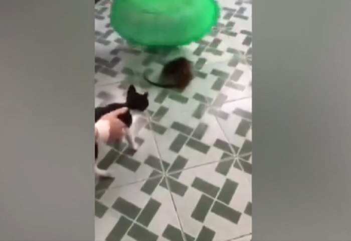 Vừa nhìn thấy con chuột, chú mèo đã kinh hoảng bỏ chạy thục mạng.