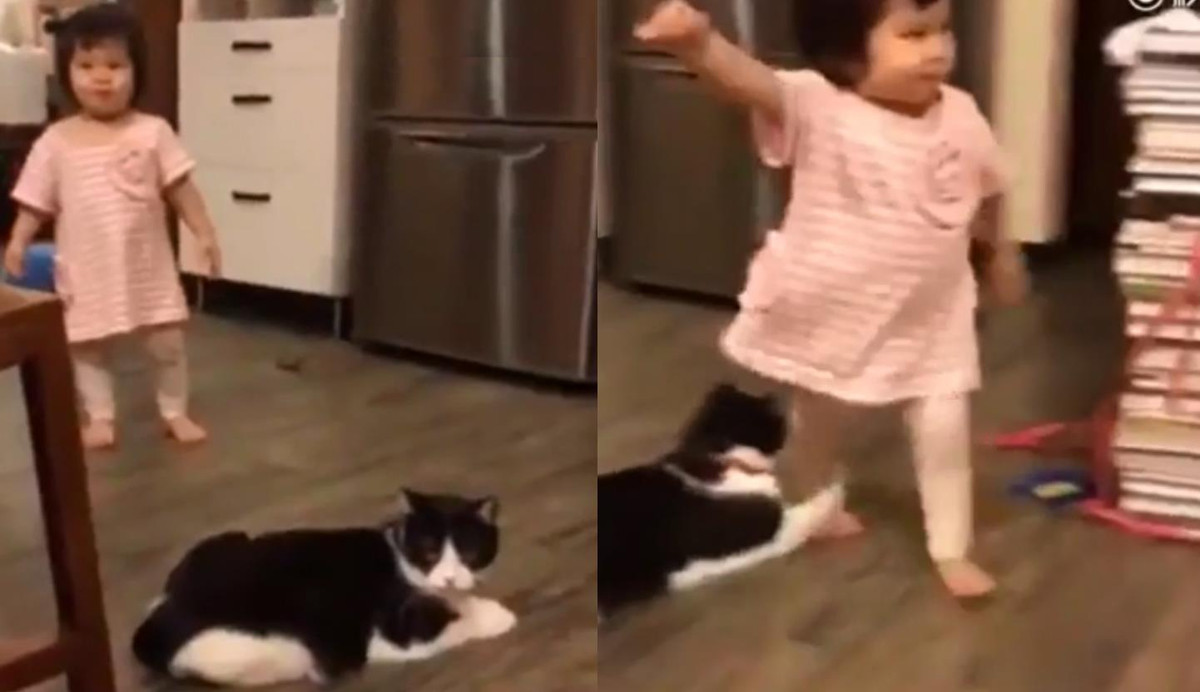 Khi thấy bé con đi tới, chú mèo nghịch ngợm thò chân trước ra ngáng đường.