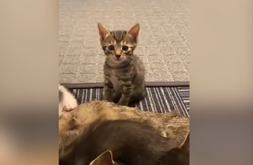 Mèo con chỉ biết đứng tròn mắt nhìn bố và các anh chị uống sữa mẹ trong khi mình không có phần.