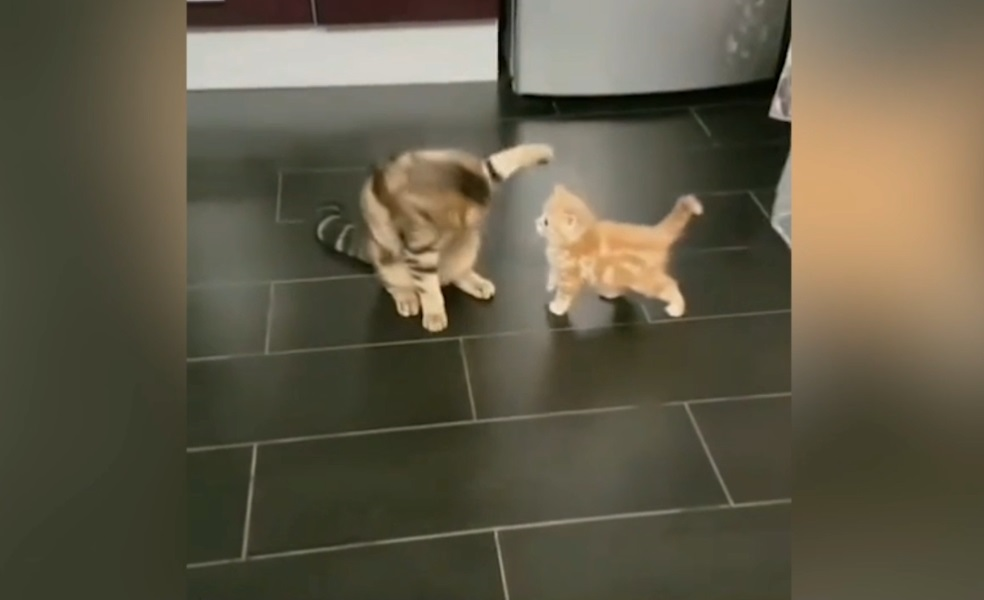 Liên tục bị "đại ca" gõ đầu, mèo con tức chí bèn vùng lên tung chưởng khiến mèo lớn giật mình lùi ra sau, dáng vẻ đầy cảnh giác, e ngại.
