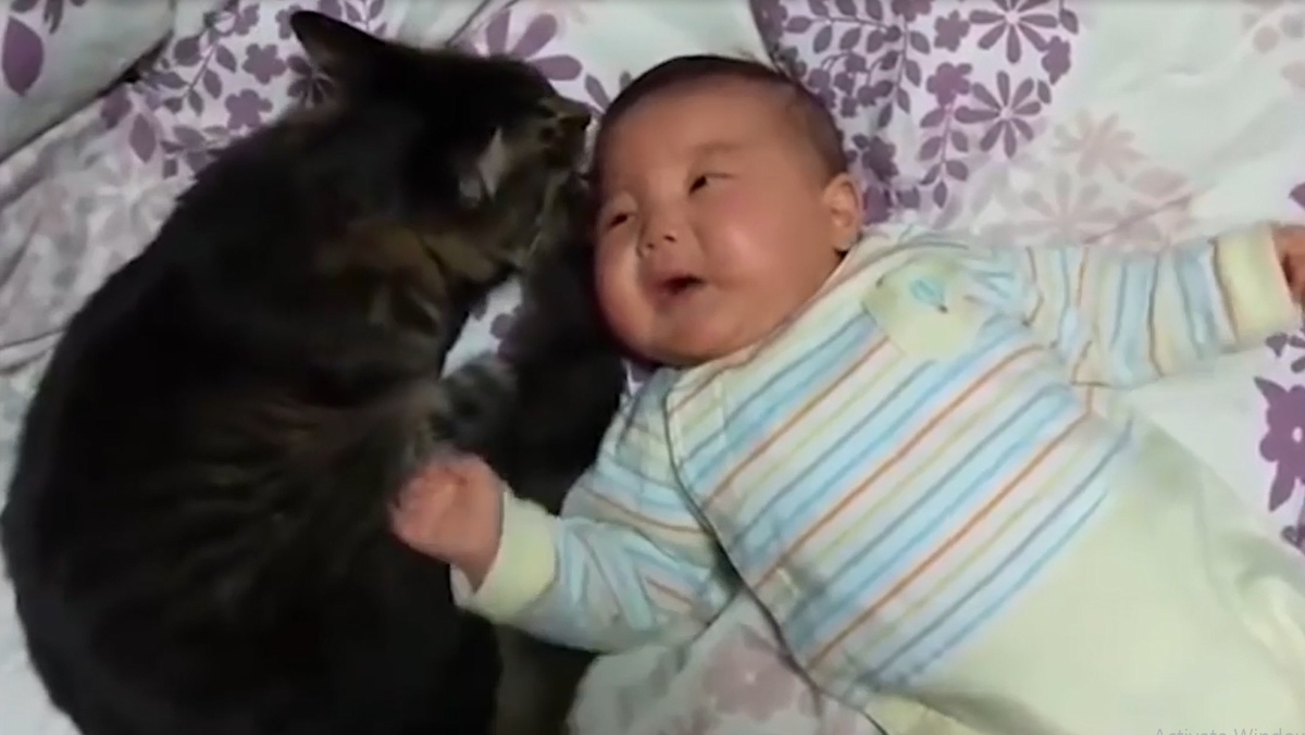 Em bé đang khóc ré bỗng im thin thít khi chú mèo bên cạnh dỗ dành, an ủi.