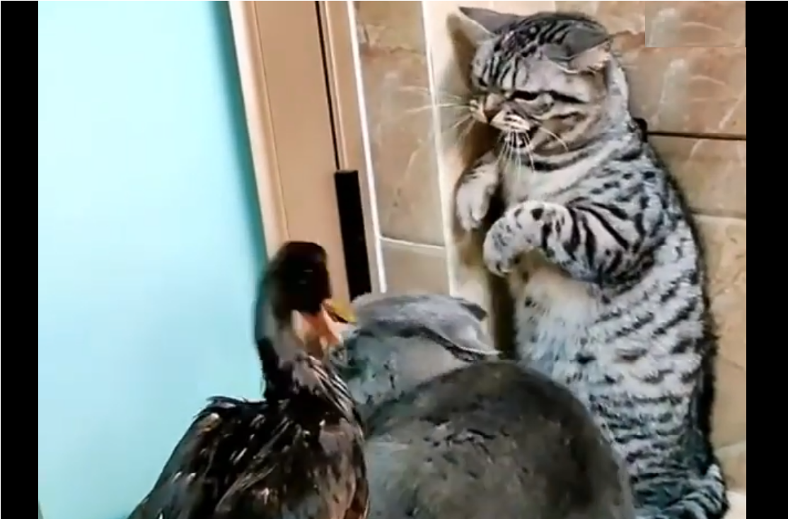 Chú mèo cậy có đông đồng bọn nên ra vẻ giang hồ, tưởng đánh thắng vịt, ai dè bị đánh cho te tua.
