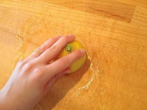 Hãy làm ướt thớt bằng hỗn hợp giấm và nước, cắt nửa quà chanh và cho muối lên đó rồi chà lên mặt thớt. Cuối cùng, hãy đổ dầu lên khăn và lau lại thớt.