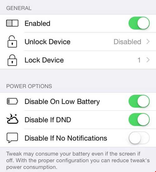 Người dùng có thể thay đổi một số thiết lập của Wave2Wake trong phần Settings, đơn cử như tự động tắt khi pin yếu (Disable On Low Battery), vô hiệu hóa khi chế độ Do Not Disturb được kích hoạt (Disable If DND) hoặc khi có thông báo trên màn hình khóa (Disable If No Notifications).