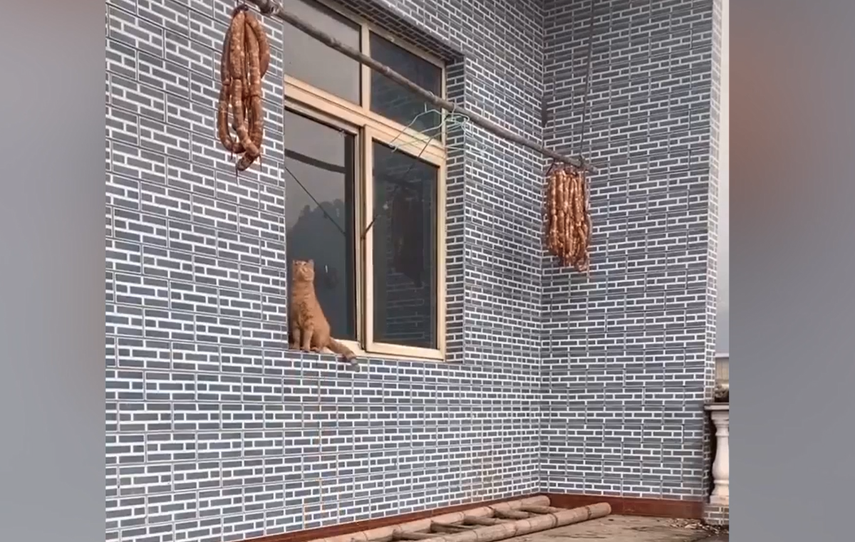 Dù đồ ăn đã được treo ở trên cao, chú mèo tham ăn vẫn bất chấp và phải nhận cái kết đau đớn.
