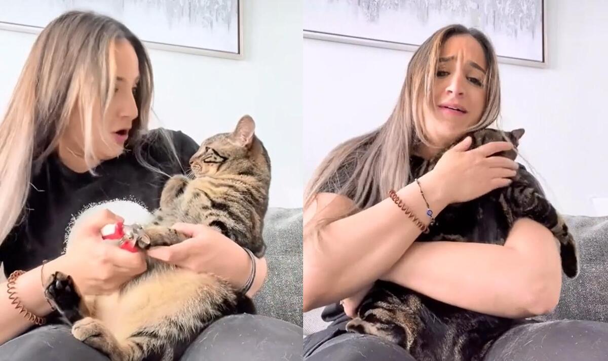 Cô chủ giả vờ làm đau mèo cưng khi bấm móng khiến nó tưởng thật, liền sà vào lòng cô tỏ vẻ yếu đuối.