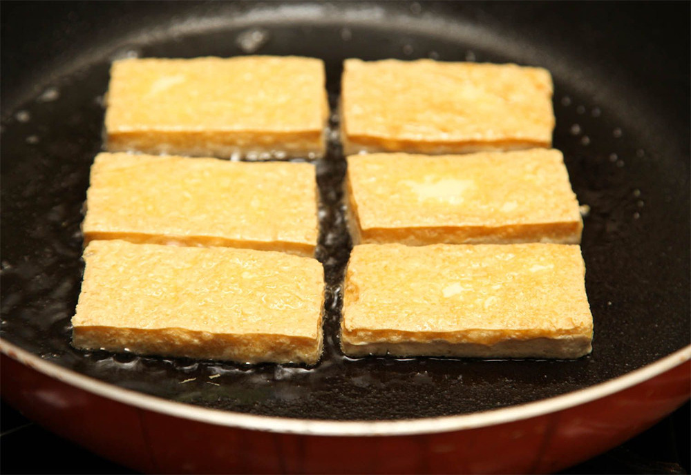 - Không đảo, lật quá sớm: Khi mới thả đậu vào chảo, bạn không nên đảo ngay mà hãy chờ khoảng 2-3 phút để đậu se mặt và có lớp vỏ giòn. Sau đó, dùng đũa hoặc xẻng nhẹ nhàng lật để tránh làm nát miếng đậu.