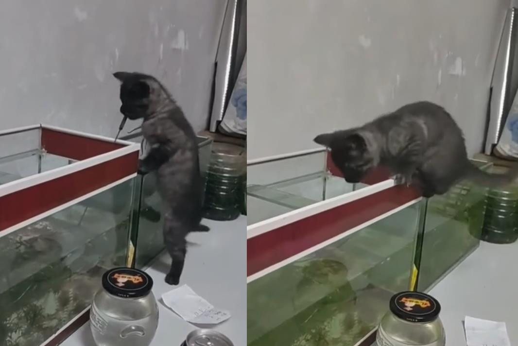 Mèo ranh mãnh biết dùng vợt để bắt cá trong bể