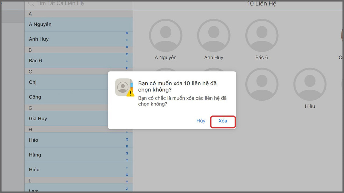 Bước 5: Khi chọn xong, nhấn phím Delete trên bàn phím và xác nhận xóa danh bạ.