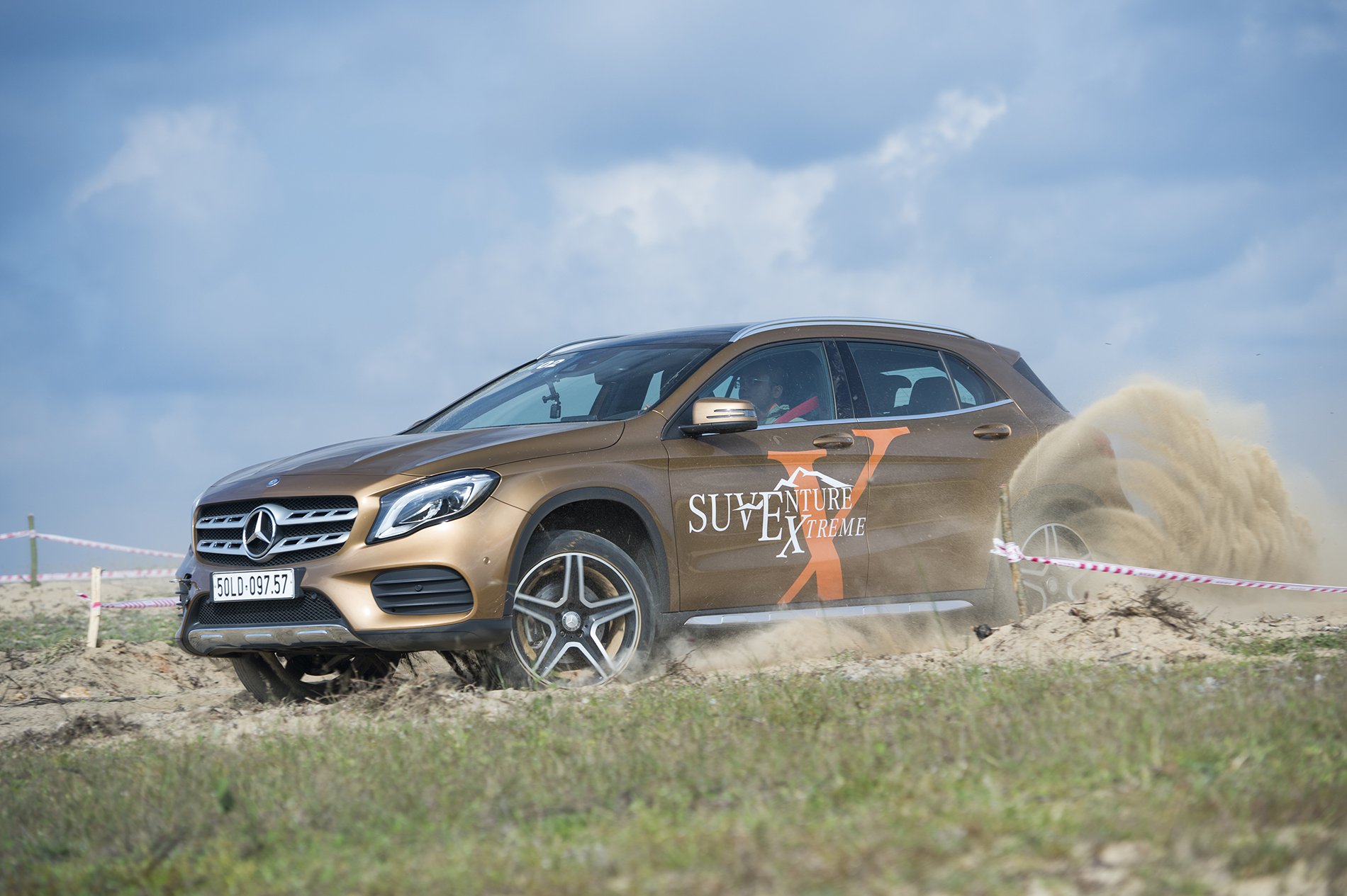 Hào hứng nhất là khi các chiến binh SUV thử tài chinh phục đồi cát biển Lăng Cô, với dải cồn cát hẹp có cao độ từ 5 – 23 m chạy dài 8 – 9 km. Dù là mẫu SUV nhỏ nhất, nhưng GLA 250 4MATIC chứng minh khả năng vượt địa hình nhẹ nhàng linh hoạt, nhờ trọng lượng nhẹ cùng chế độ Off-Road với lực bám vượt trội. Ở các góc cua gắt ở tốc độ thấp, hệ thống kiểm soát lực kéo 4-ETS kết hợp hệ dẫn động 4 bánh toàn thời gian 4MATIC chủ động giúp xe giảm tốc ở bánh sau phía trong góc cua để giảm bán kính vòng quay, giúp xe vào cua nhanh chóng và gọn gàng hơn.
