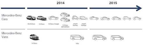 Một sơ đồ lấy từ slide thuyết trình của Mercedes đã bị lộ ra trên Facebook. Thông qua sơ đồ này, chúng ta có thể biết chắc chắn được kế hoạch ra mắt sản phẩm mới của Mercedes trong năm 2015.