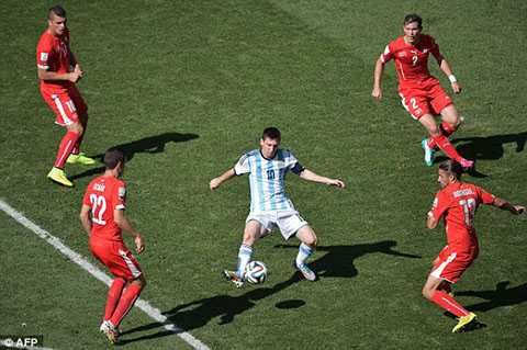 | Messi bị hậu vệ Thụy Sỹ quây chặt |