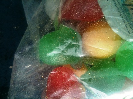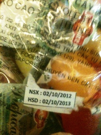 Quan sát trong kệ hàng có trên 10 bịch (túi) ni-lon nhựa chứa nhiều thỏi rau câu nhiều màu sắc, trọng lượng 3kg/bịch. Ngoài bao bì dán tờ giấy in chữ sơ sài “NSX: 02/10/2012; HSD: 02/10/2013”. Tuy nhiên, điều đáng nói, tờ giấy này lại dán đè lên giấy cũ nằm phía dưới rách loang lỗ.