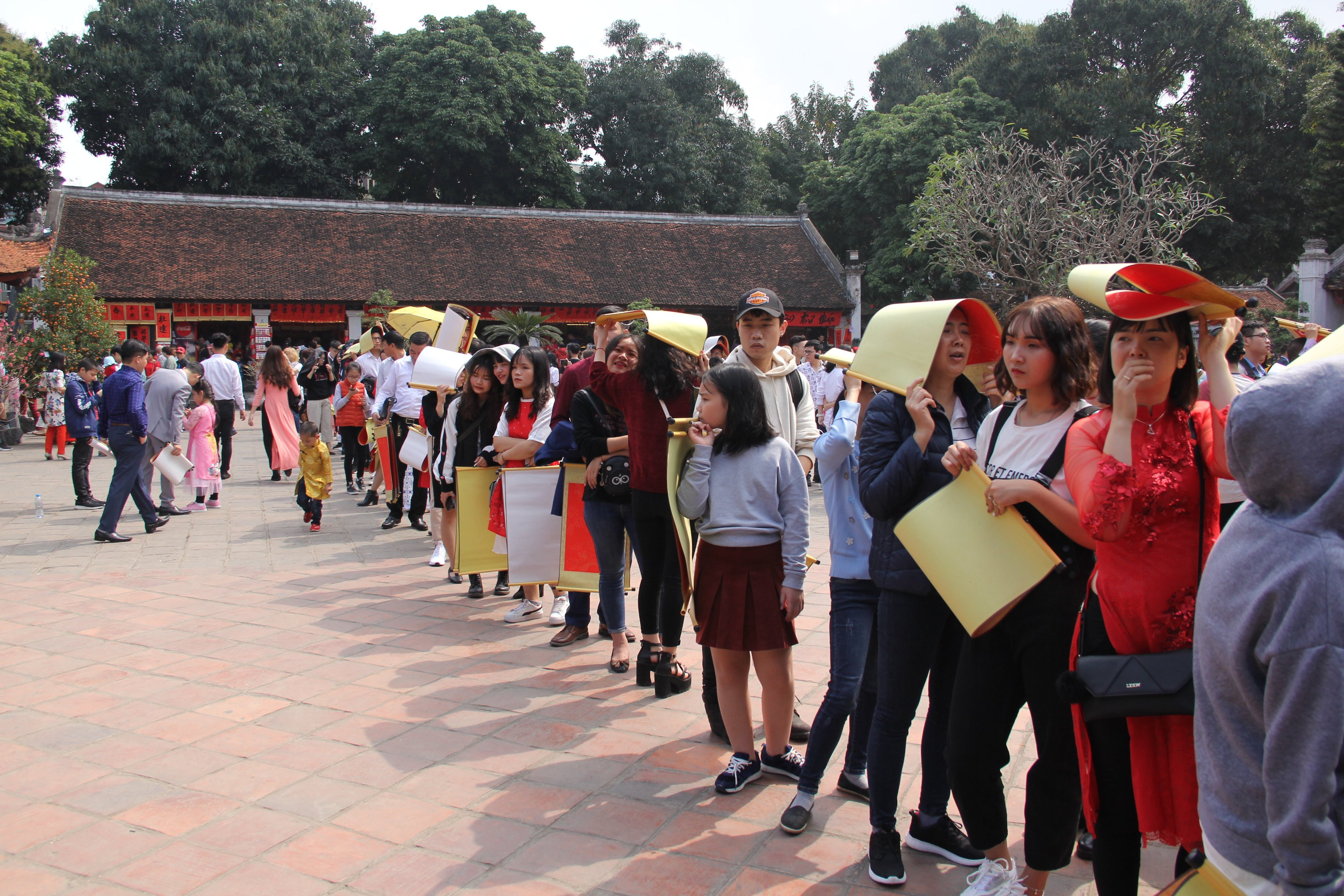 Người dân xếp hàng xin chữ đầu năm tại Văn Miếu -- Quốc Tử Giám dưới trời nắng nóng.