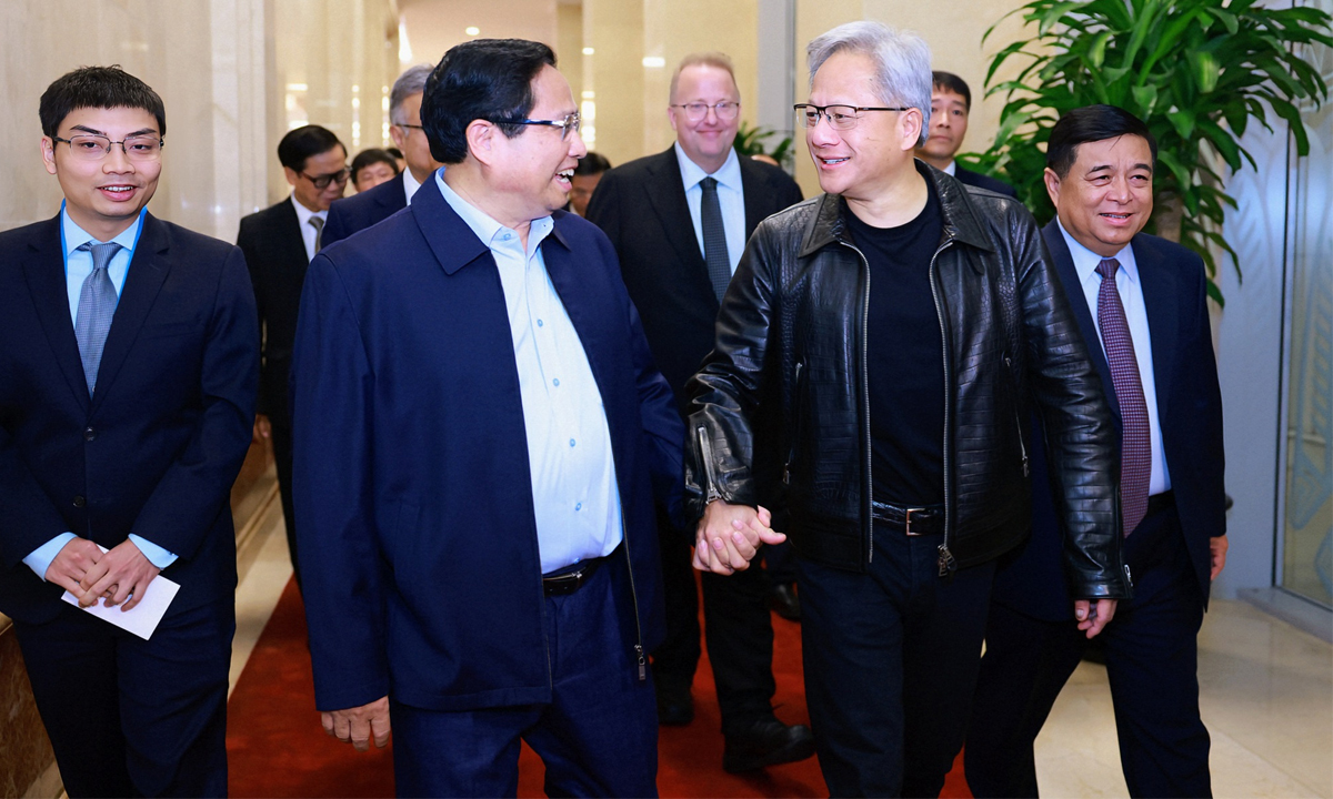 Thủ tướng Phạm Minh Chính chào mừng ông Jensen Huang (nhà sáng lập, Chủ tịch Tập đoàn NVIDIA) đến thăm và làm việc tại Việt Nam hồi tháng 12/2024. (Ảnh: VGP)