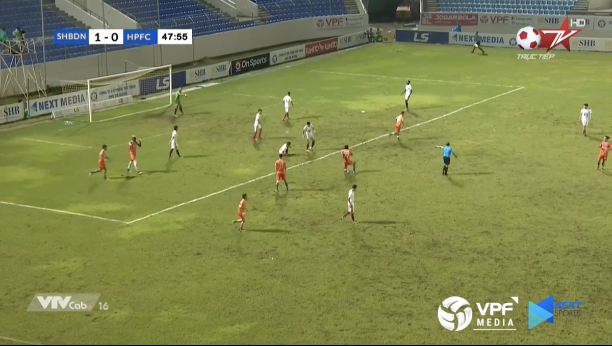 Trận đấu giữa SHB Đà Nẵng và CLB Hải Phòng chiều qua (10/10) diễn ra trên mặt sân xấu và lầy lội. Vạch sân bị kẻ méo mó, nguệch ngoạc; mặt sân không đủ tốt để trái bóng lăn với tốc độ bình thường.