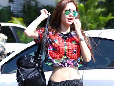Mặc dù thời tiết khá nắng nóng, nhưng cô vẫn diện áo croptop để lộ toàn vộ vòng 2 thon nhỏ của mình.