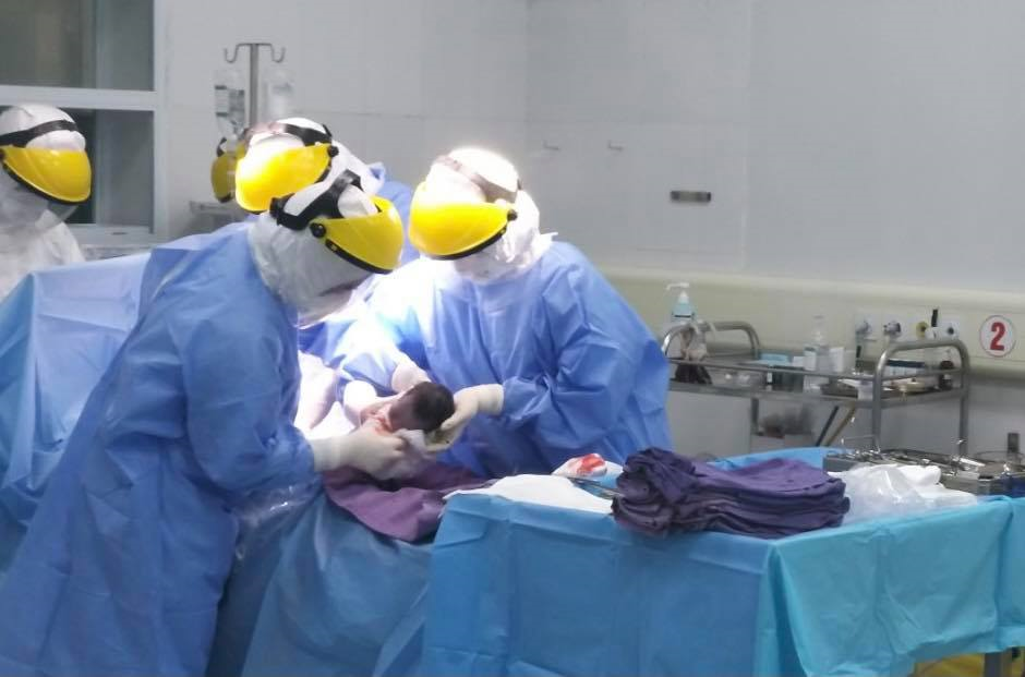 Các bác sĩ mổ bắt thai cho sản phụ ngay trong khu cách ly.