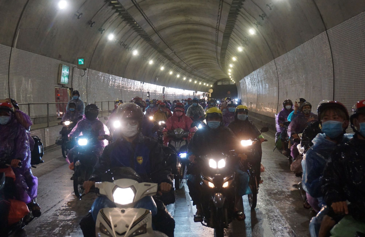 Người dân từ các tỉnh phía Nam về quê tránh dịch chạy xe máy qua hầm Hải Vân.