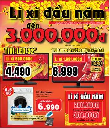 Đến với Lì xì đầu năm của Pico, khách hàng sẽ được mua những sản phẩm điện máy với mức giảm giá lì xì lên tới 3 triệu đồng. Chương trình kéo dài trong 5 ngày, từ mùng 6 đến hết mùng 10 Tết.