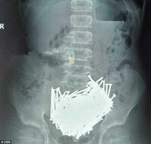 Hình chụp CT có thể thấy rõ 200 chiếc đinh nằm trong bụng cậu bé 15 tuổi.