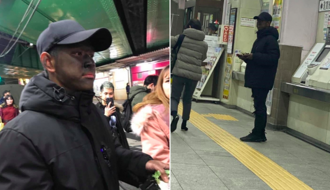 Hình ảnh nam thanh niên mặc đồ đen, bôi mặt nhọ xin tiền gây xôn xao tại Nhật. (Ảnh: MXH)