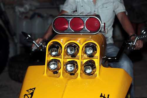 Ngoài hộp số tự động như ô tô thì “khủng long chúa” còn được trang bị thêm hộp số de giúp xe có thể di chuyển lùi về sau rất linh hoạt. Sau khi độ lần hai thì dàn đèn 6 bóng cả cos và pha nằm hai bên đã được đem lên phía trên mui xe phát sáng cả khu vực. Ngoài ra, bên cạnh hai bên bánh xe trước được trang bị thêm hai dải đèn LED đa màu sắc, tạo cho xe long lanh hơn khi di chuyển trên đường.