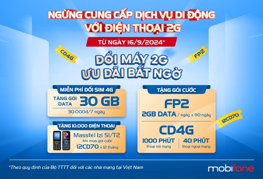 Cụ thể, MobiFone tặng gói cước FP2 (2GB/ ngày trong 90 ngày) cho các khách hàng sử dụng điện thoại 2G chuyển đổi lên sử dụng smartphone (sau 3 tháng gia hạn thành gói MXH100) và gói cước CD4G (1.000 phút thoại nội mạng MobiFone và 40 phút thoại ngoại mạng, sử dụng trong 30 ngày) cho các khách hàng sử dụng điện thoại 2G chuyển đổi lên sử dụng feature phone 4G (sau 1 tháng gia hạn với giá 50.000 đồng/ tháng).