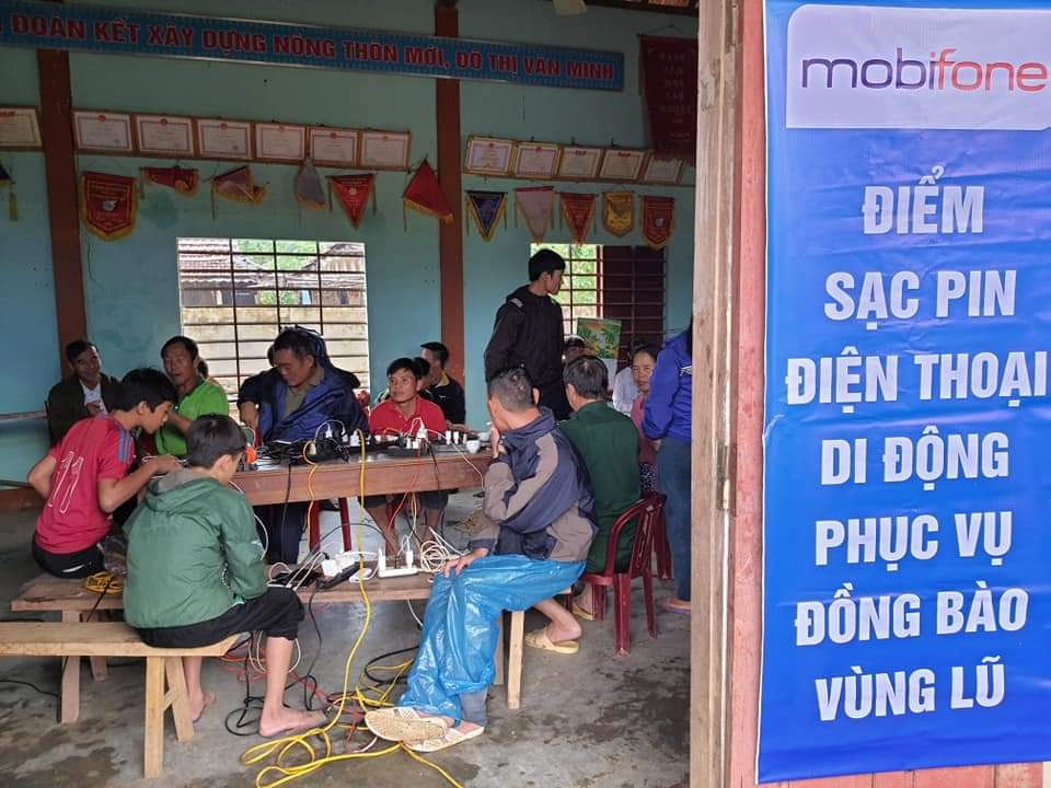 MobiFone thiết lập các điểm sạc pin điện thoại và cung cấp đèn pin dự phòng phục vụ người dân vùng lũ.