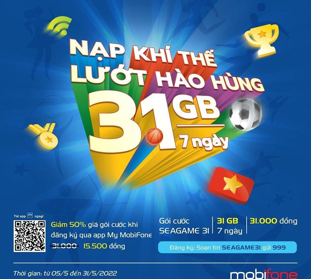 Từ ngày 05/5/2022 đến hết ngày 31/5/2022, chỉ với 31.000 đồng, chủ thuê bao MobiFone khi đăng ký gói SEAGAME31 sẽ nhận ngay 31 GB data tốc độ cao sử dụng trong vòng 7 ngày. Đặc biệt, nhận ưu đãi lên đến 50% giá gói cước khi đăng ký gói cước trên ứng dụng My MobiFone. Để đăng ký soạn tin DK SEAGAME31 hoặc SEAGAME31 gửi 999.