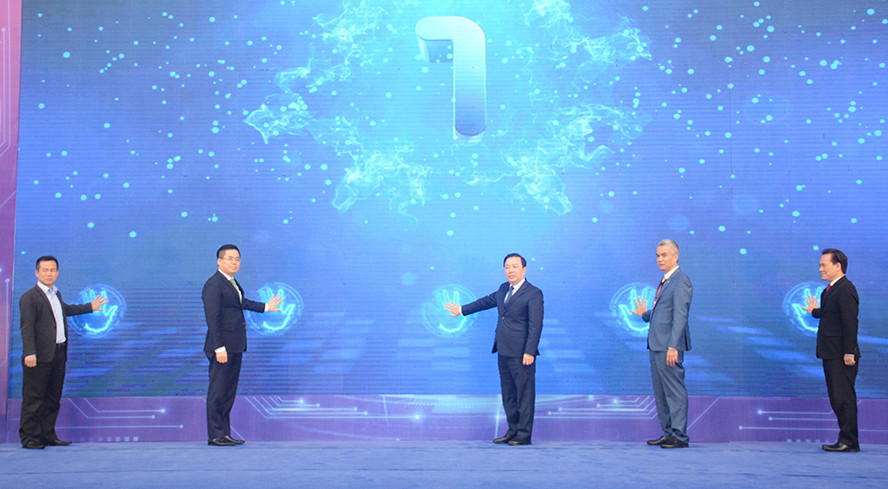 Các đại biểu thực hiện nghi thức khai mạc triển lãm "Chuyển đổi số và đổi mới sáng tạo Hà Nội năm 2022".