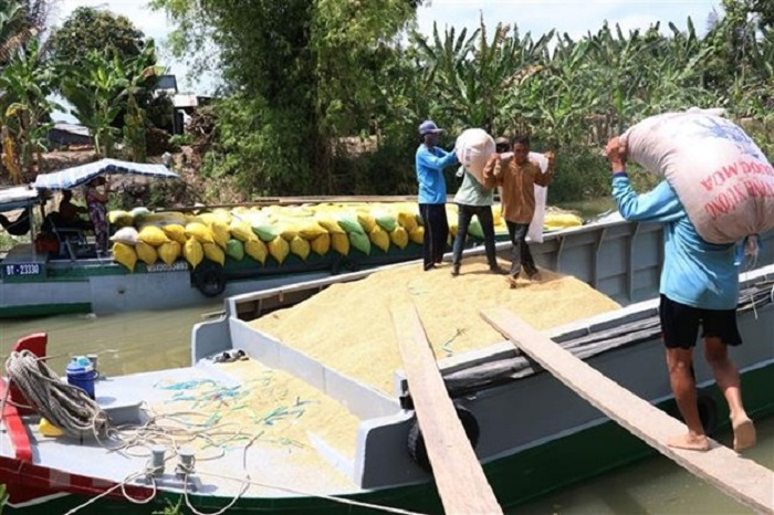 Nông dân xã Tân Mỹ, huyện Thanh Bình (Đồng Tháp) tập trung lúa thu hoạch bán cho thương lái. (Ảnh: TTXVN)