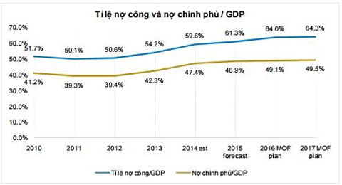 Tỷ lệ nợ công/GDP của Việt Nam có xu hướng tăng liên tục với tốc độ khá nhanh, từ mức 51,7% năm 2010 lên mức 59,6% năm 2014 và ước tính sẽ đạt mức 64,3% trong năm 2017 (áp sát mức trần 65% mà Quốc hội cho phép). Đặc biệt giai đoạn 2013-2014, việc phát hành khối lượng lớn trái phiếu Chính phủ đã khiến nợ công tăng mạnh.