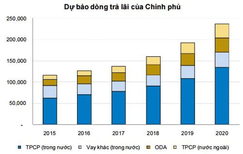 Theo tính toán của CTCP Chứng khoán Bảo Việt (BVSC), tổng số lãi phải trả hàng năm của Chính phủ sẽ tăng lên 236 nghìn tỷ đồng vào năm 2020, tăng gấp đôi so với nghĩa vụ trả lãi vào năm 2015, 115 nghìn tỷ đồng. Áp lực trả lãi chủ yếu đến từ TPCP, chiếm hơn 50% vào năm 2020.