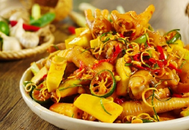 - Lấy bát lớn cho chân gà, xoài, quất, sả, lá chanh và ớt vào, rưới nước sốt lên các nguyên liệu và dùng tay trộn đều (có thể cho vào âu có nắp để xóc). Để gia vị ngấm đều khoảng 10 phút thì cho chân gà ra đĩa và thưởng thức.
