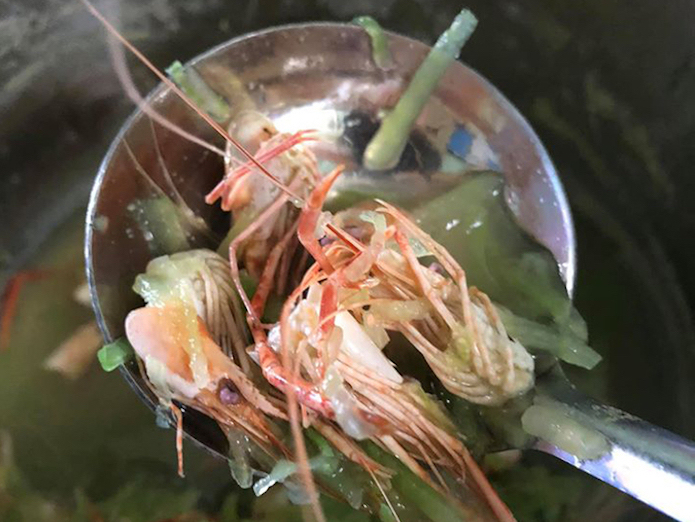 "Ổng lười không xay đầu tôm lọc lấy nước nấu canh như em làm mà bỏ vào nồi nấu luôn còn thịt tôm ổng rim cho em ăn rồi cả nhà ạ. Lúc bê nồi canh vào em cười không nhặt được mồm. Em hỏi sao nấu như này ăn kiểu gì thì ổng chữa là ăn này cho nhiều canxi đó. Ở chỗ em là mọi người hay xay đầu tôm lọc vỏ bỏ đi rồi nấu canh đó cả nhà vì nó ngọt nước thôi chứ không phải vì canxi đâu".