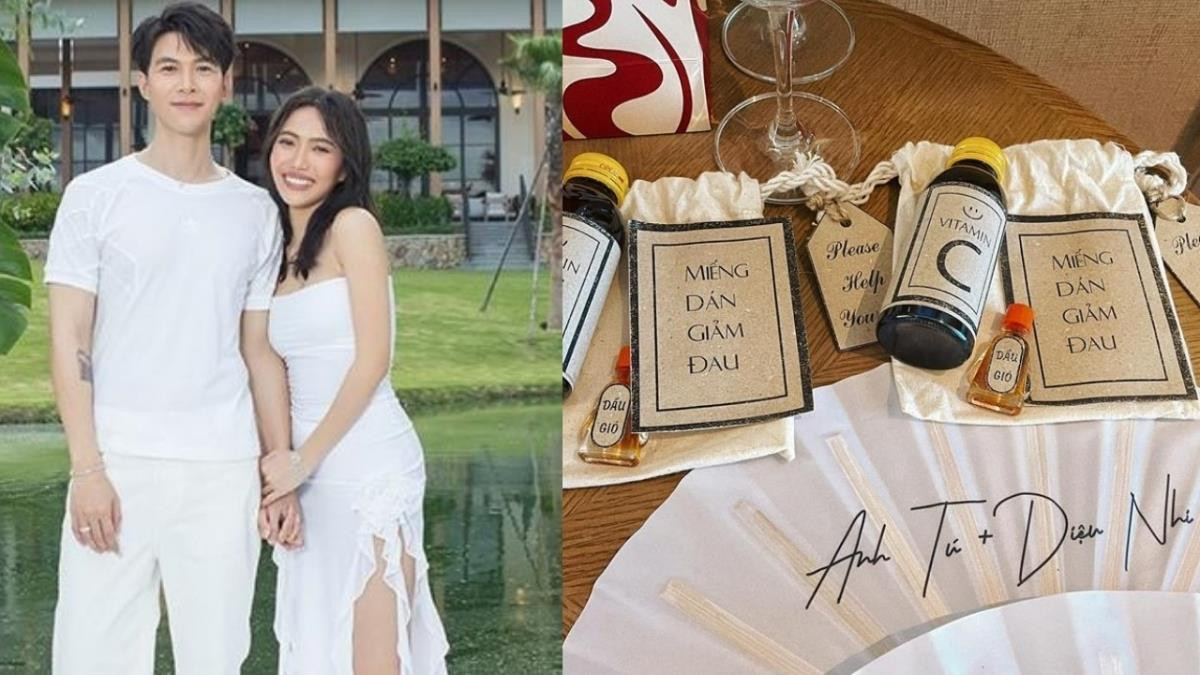 Cách đây ít phút, trợ lý của Diệu Nhi đã đăng tải bức ảnh tiết lộ món quà mà cặp đôi đã chuẩn bị để dành tặng các khách mời đến tham dự lễ cưới kèm dòng trạng thái hài hước: “Ngay lúc này, toàn bộ set quà "tự cứu chính mình" đã có mặt tại tất cả phòng của khách mời đám cưới Anh Tú - Diệu Nhi. Giữa một khách sạn 5 sao lớn nhất Phan Thiết, dấu hỏi lớn về tiệc bí mật ngày mai, 10/10?”. Liệu đây có phải điều bí mật mà cặp đôi dành tặng cho khách mời?
