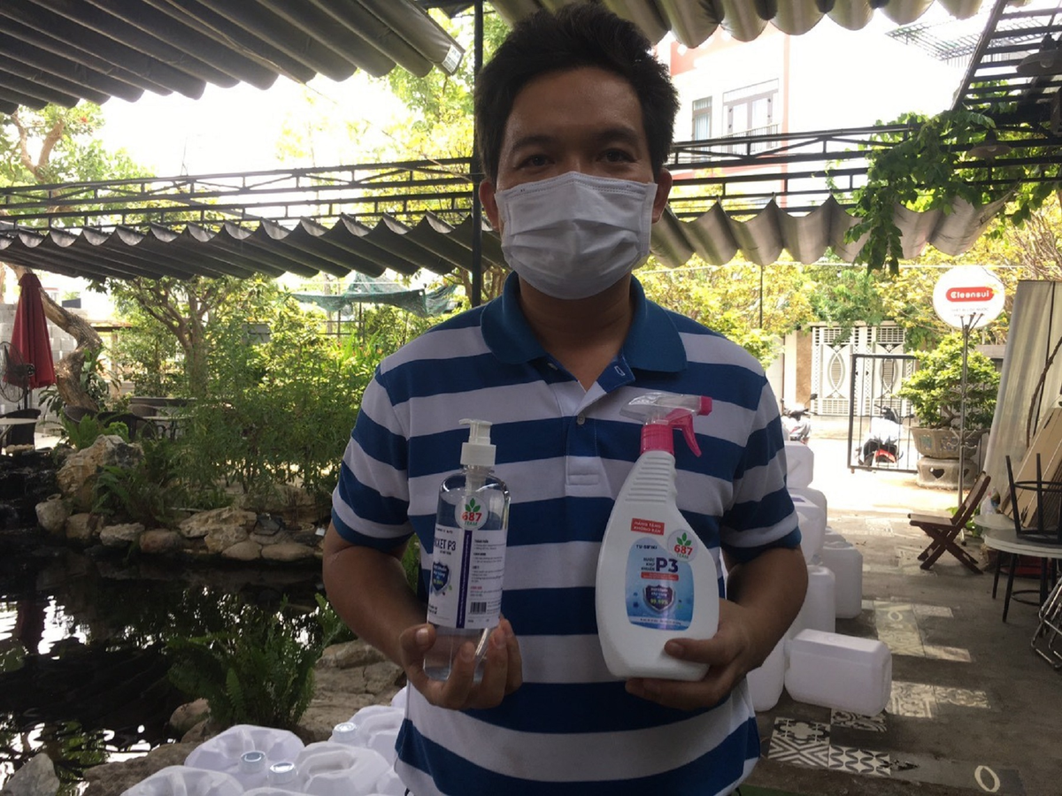 Anh Mai Anh Đức và sản phẩm sát khuẩn cung cấp miễn phí cho các bệnh viện, trường học.