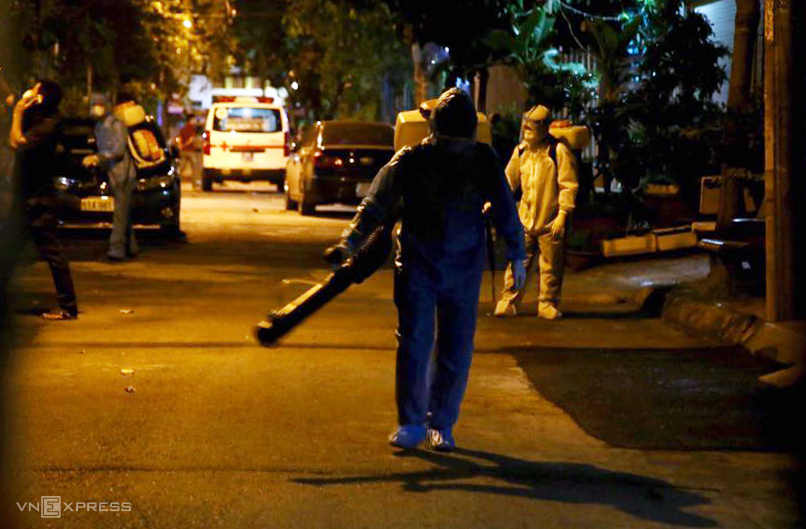 Ngành y tế khử trùng khu vực phong tỏa tối 30/7. (Ảnh: Đinh Văn)