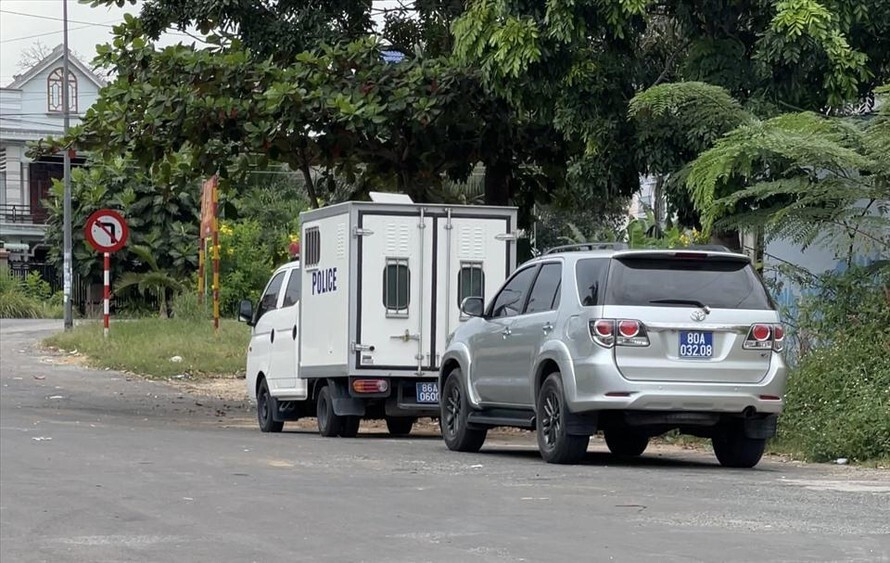 Xe của Cơ quan điều tra Viện Kiểm sát Nhân dân Tối cao đang chờ một tổ hoàn tất thủ tục tại Công an xã Tân Đức.