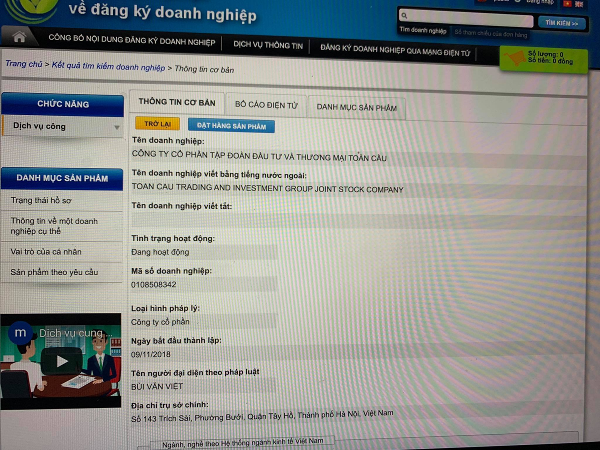 Thông tin về Công ty Cổ phần Tập đoàn Đầu tư và Thương mại Toàn Cầu trên Cổng thông tin quốc gia.