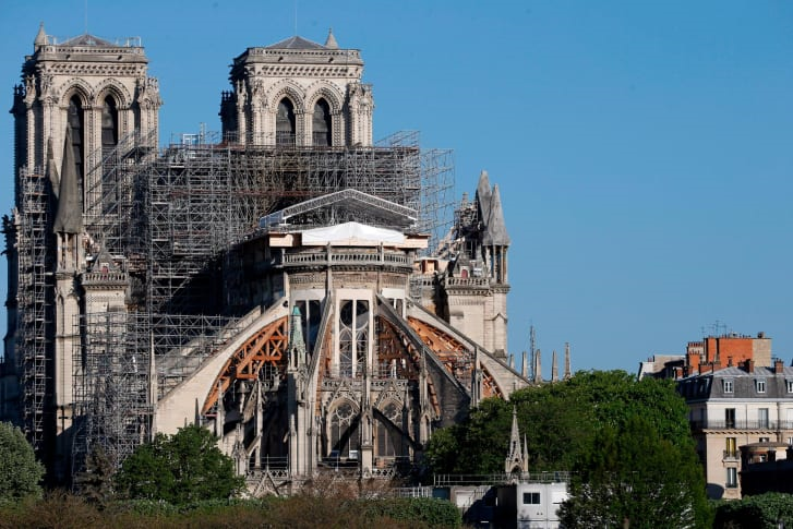 Nhà thờ Đức Bà một năm sau đám cháy thảm họa phá hủy phần tháp nhọn và mái vòm. (Ảnh: Getty)