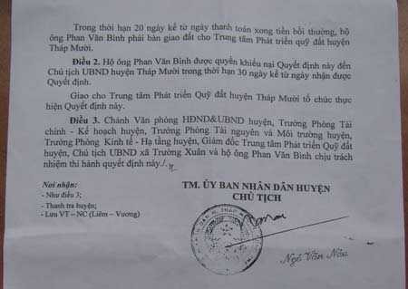 Chủ tịch UBND huyện Tháp Mười (tỉnh Đồng Tháp) Ngô Văn Nâu vừa ký Quyết định số 525/QĐ-UBND bồi thường, hỗ trợ với số tiền gần 5,3 tỷ đồng sau gần 14 năm ròng ông Phan Văn Bình (sau này ủy quyền cho con gái là bà Phan Thị Kim Phụng) ngụ xã Trường Xuân khiếu nại do bị thu hồi đất không đúng quy định.