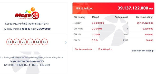 Ngày 26/9, Công ty Xổ số Điện toán Việt Nam (Vietlott) cho biết, trong kỳ quay 643 của sản phẩm Mega 6/45, đơn vị này đã xác định có một tấm vé trúng giải độc đắc trị giá hơn 39 tỷ đồng.